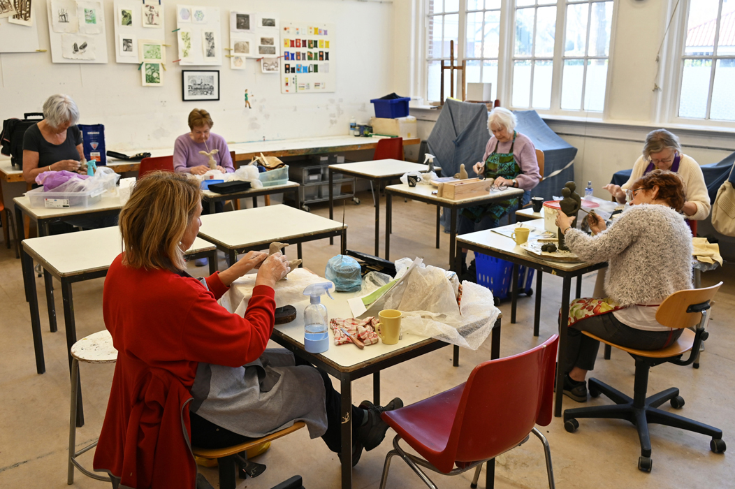 ‘Op zoek naar een persoonlijke oplossing voor alle voorkomende vormproblemen’. Zo omschrijft de groep haar activiteiten. In atelier 3 worden beelden gemaakt. Naar keuze in steensoorten als albast, speksteen, serpentijn en marmer. Er wordt in kleine en grotere formaten gehakt, gevijld en geschuurd, een langdurig proces. Tegelijkertijd wordt in atelier 4 gewerkt met klei, was of gips. Men maakt portretten, maar ook andere beelden. De beelden kunnen worden gebakken, maar er worden ook mallen gemaakt van siliconen en gips. De sfeer in de groep is heel plezierig: op een ontspannen manier wordt geprobeerd een nieuwe manier van kijken te ontwikkelen.