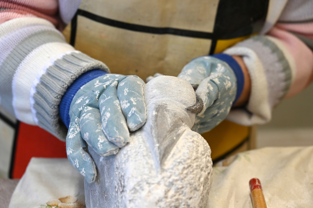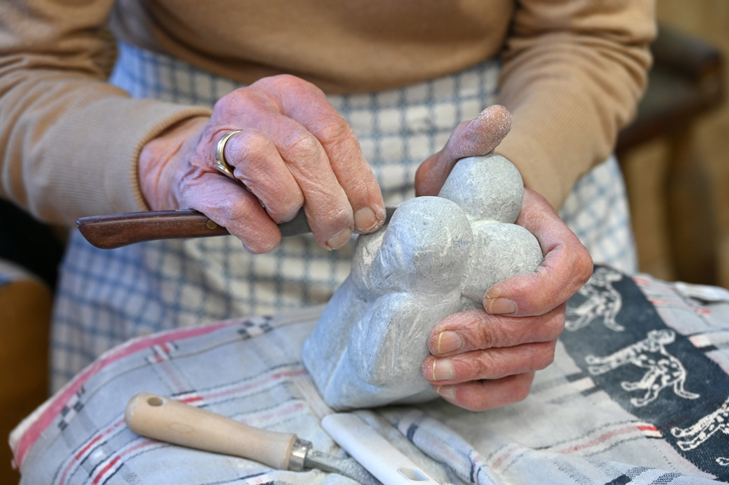Marja werkt graag met steen door erin te hakken, zagen en te polijsten. Ook werkt ze met acrylaat: een mooie afwisseling met donkere was, klei en steensoorten.